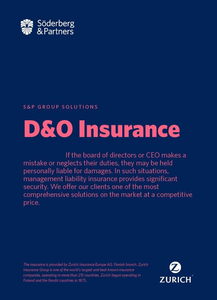 Directors and Officers (D&O) liability insurance is one of the most important types of business insurance. A good D&O policy provides peace of mind and protection for executives and board members. As an insurance management client of Söderberg & Partners, you can obtain one of the best D&O liability insurance policies in Finland.
