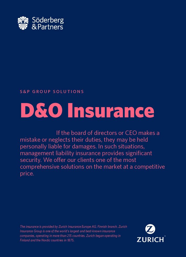 Directors and Officers (D&O) liability insurance is one of the most important types of business insurance. A good D&O policy provides peace of mind and protection for executives and board members. As an insurance management client of Söderberg & Partners, you can obtain one of the best D&O liability insurance policies in Finland.