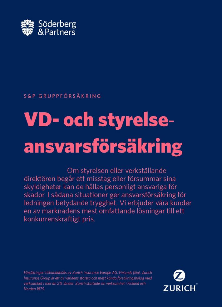 VD- och styrelseansvarsförsäkring är en av de viktigaste företagsförsäkringar. En bra VD- och styrelseansvarsförsäkring ger arbetsro och trygghet i ledningens och funktionärernas arbete. Som kund hos Söderberg & Partners kan du få en av Finlands bästa VD- och styrelseansvarsförsäkring.